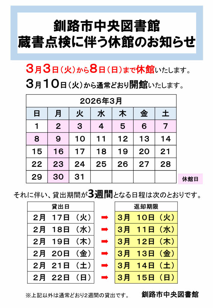 釧路市中央図書館・釧路文学館・図書館バス 蔵書点検に伴う休館のお知らせ(3月3日㊋~8日㊐休館)