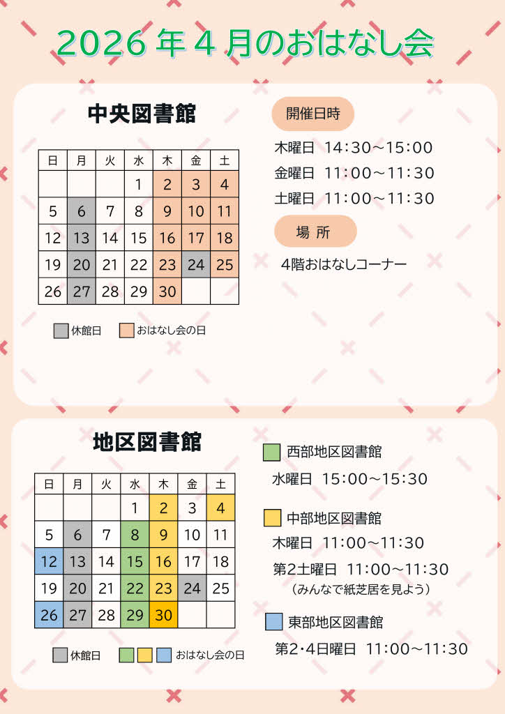 4月おはなし会のお知らせ(中央館・地区館)